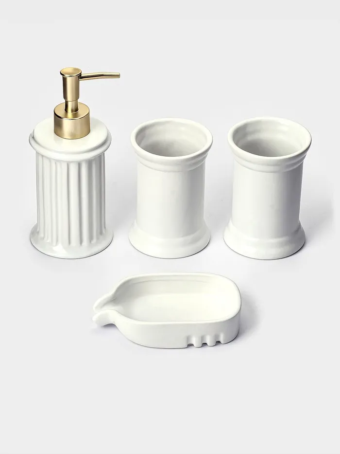 Преобразите вашу ванную комнату с элегантным набором, который сочетает в себе стиль и функциональность. Этот комплект из четырёх предметов, выполненный в классическом белом цвете, привнесёт в интерьер нотку утончённости и гармонии. Каждый элемент набора — дозатор для мыла, два стакана и мыльница — изготовлен из высококачественной керамики, что гарантирует долговечность и устойчивость к внешним воздействиям.