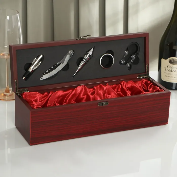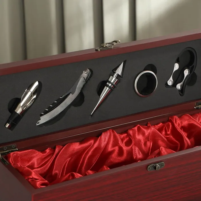 Набор поставляется в стильном деревянном кейсе, который содержит: штопор, пробку для бутылки, кольцо для бутылки, нож для фольги и каплеуловитель. Все предметы изготовлены из прочной нержавеющей стали и имеют эргономичный дизайн.