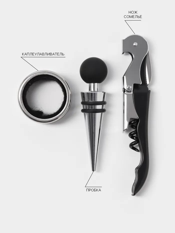 Набор для вина Magistro Cork, 3 предмета: штопор, пробка, каплеулавливатель, нержавеющая сталь — Характеристики