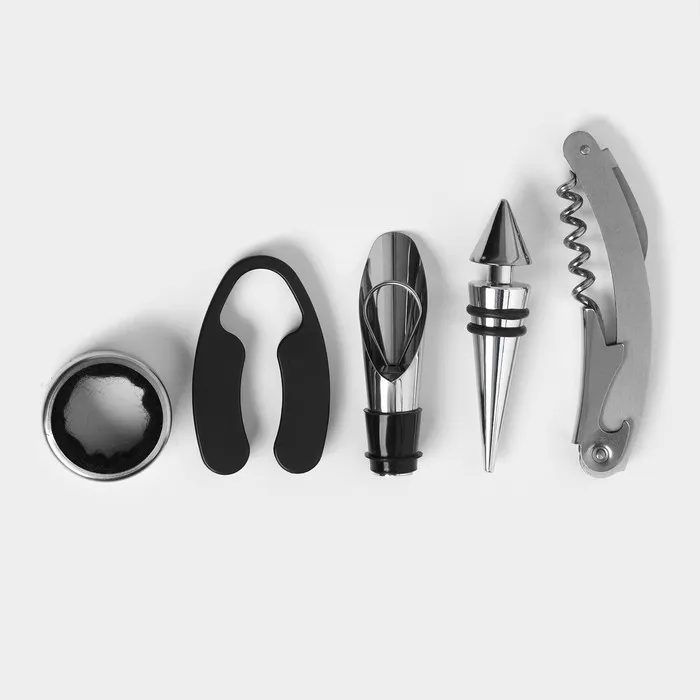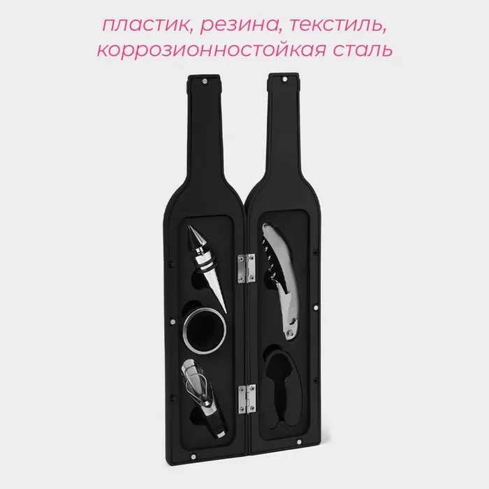 Набор для вина в кейсе Доляна «Бутылка», 5 предметов: пробка, кольцо, каплеуловитель, штопор, нож для срезания фольги — Характеристики