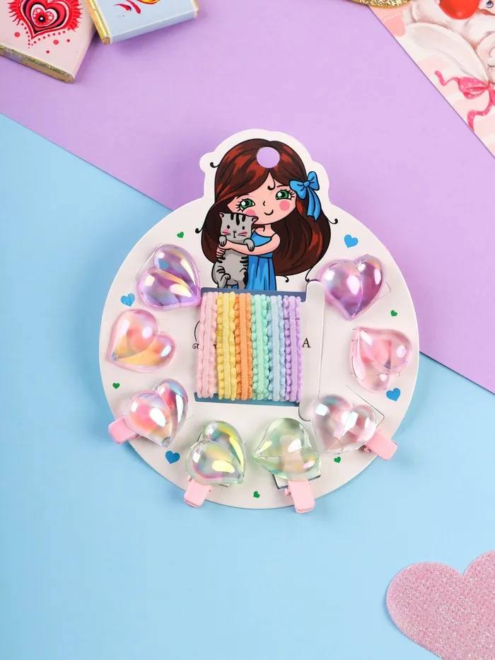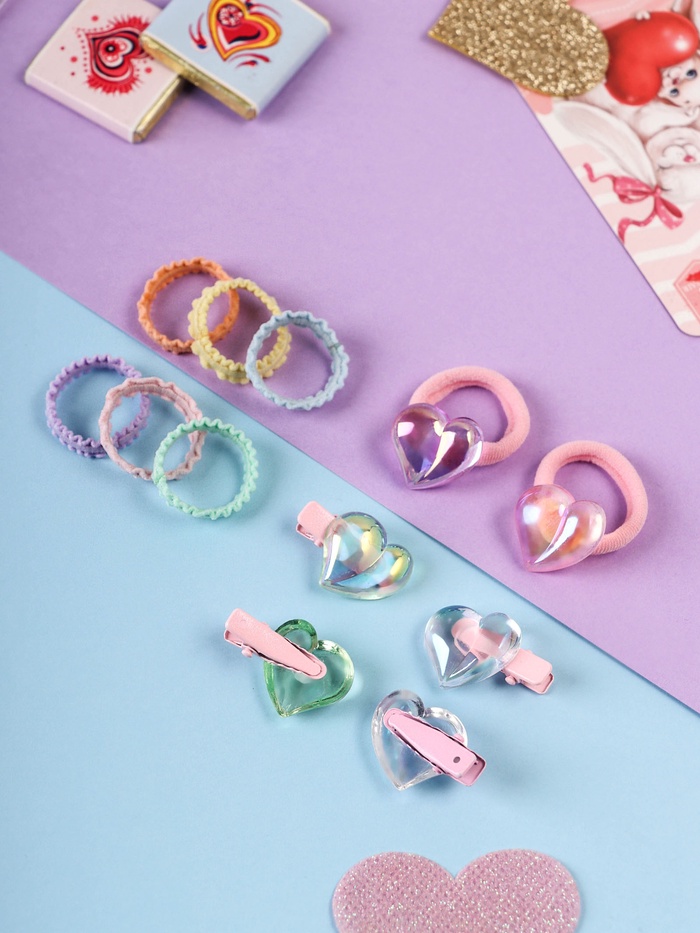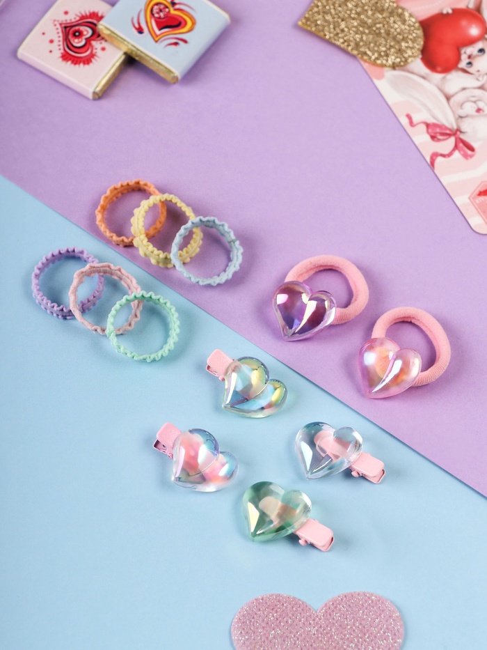 Набор для волос: 10 резинок, 4 зажима в виде сердца, разноцветные – это универсальное решение для девочек, которые любят экспериментировать с прическами и добавлять яркие акценты в свой образ.