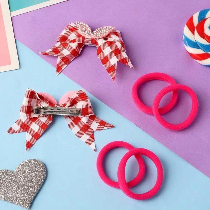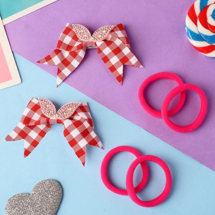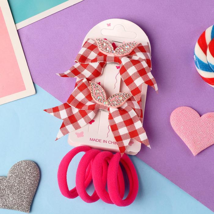 Набор для волос «Алексия», 6 шт.: 4 резинки, 2 зажима, ушки сверкание клетка,7×4 см, красно-розовый — Характеристики