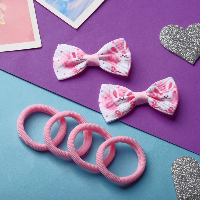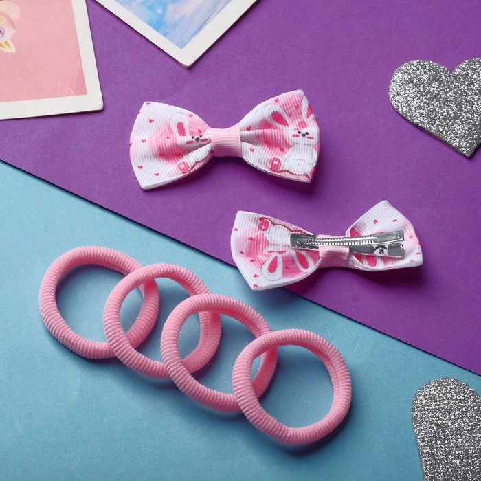 Набор для волос "Карапунька" (4 резинки, 2 зажима) зайка, 2 см, бело-розовый