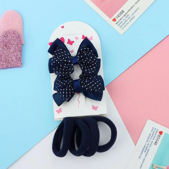 Набор для волос «Классика», 2 зажима, 4 резинки, бантик горох, синий