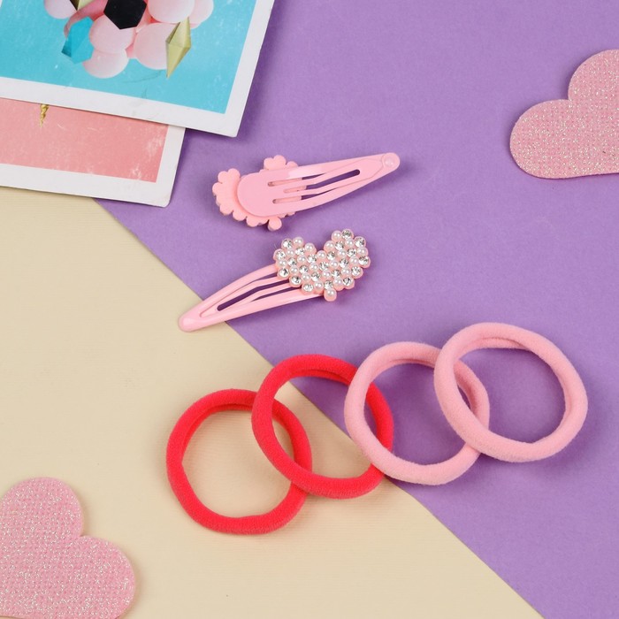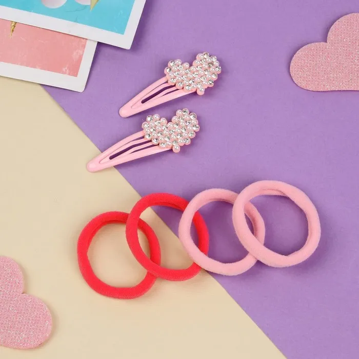 - Элегантный дизайн: в состав набора входят 4 розовых резинки и 2 миниатюрные заколки с изящными сердечками. Яркое оформление привлекает внимание и подходит для любого случая.