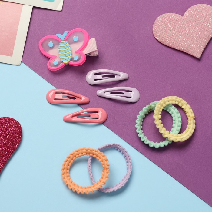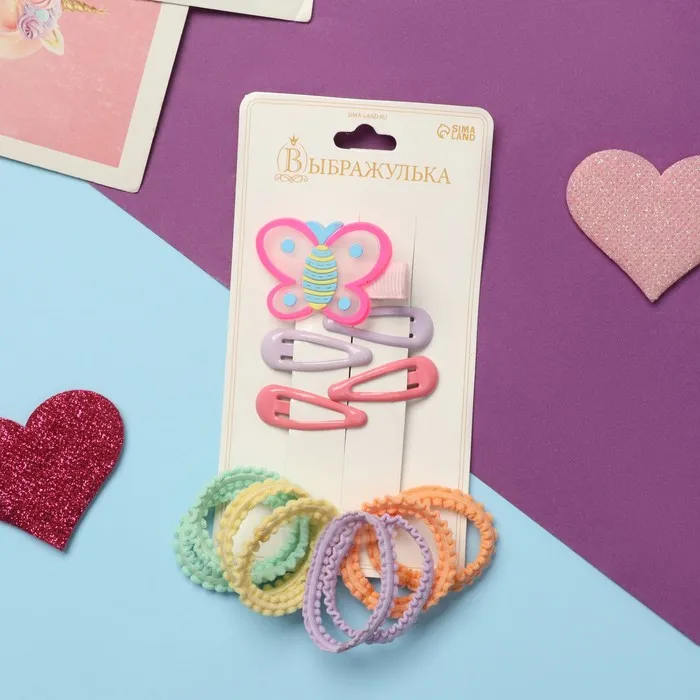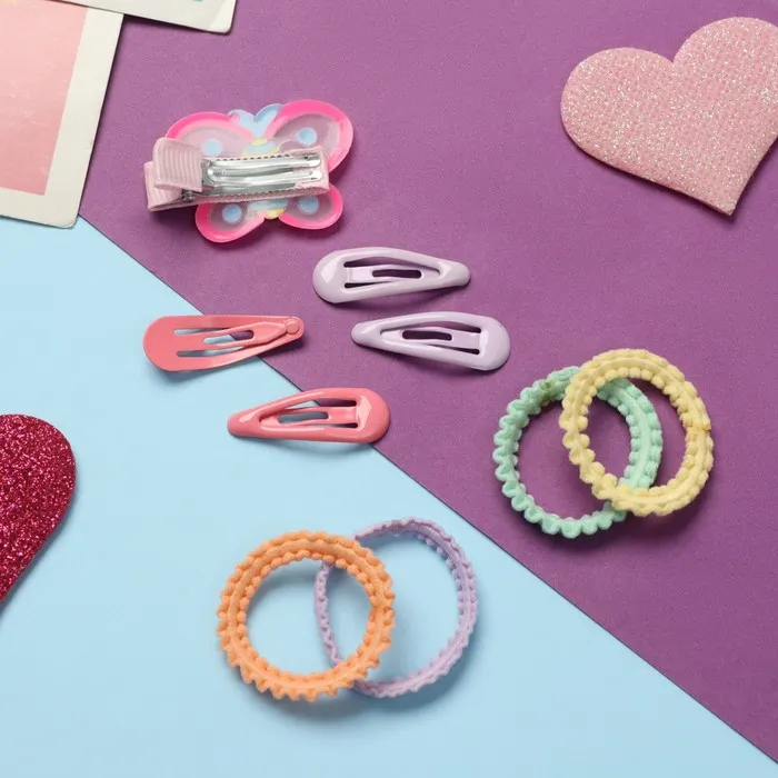 - Яркие резинки и заколки: в комплект входят 8 разноцветных резинок, идеально подходящих для создания различных укладок, и 4 невидимки для надежной фиксации. Заколка-бабочка добавит нежности и легкости любой прическе.