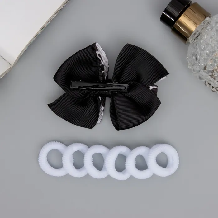 Набор аксессуаров для волос с зажимом и резинками — идеальный спутник для стильной девочки, готовой выделиться своей индивидуальностью. Сочетание черного и белого оттенков придает аксессуарам универсальный шарм, делая их интегральной частью любого образа.