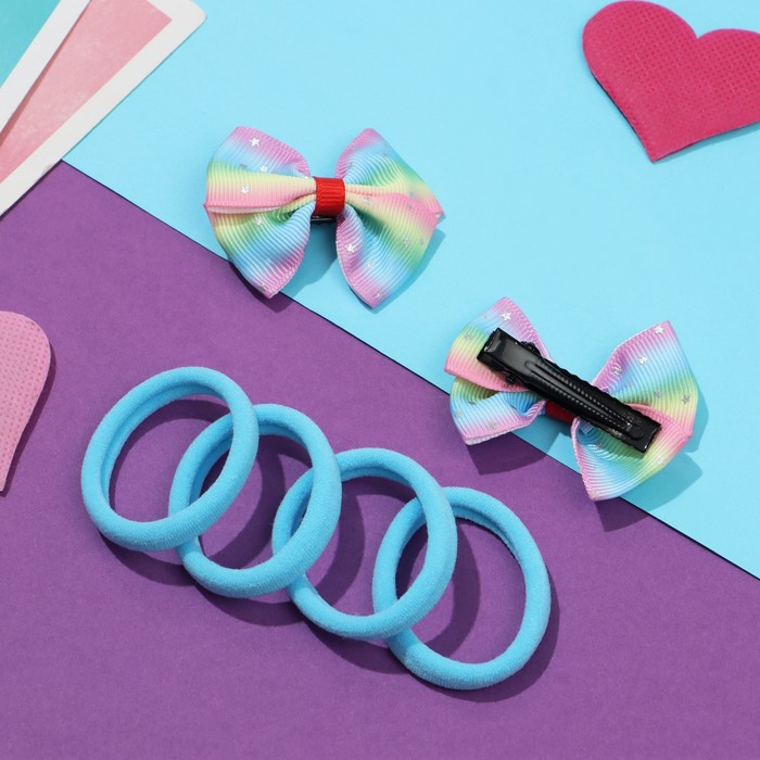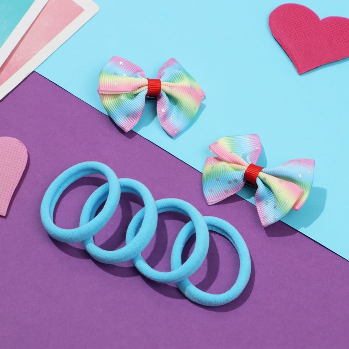 Комплект аксессуаров для волос «София» станет ярким дополнением к индивидуальному стилю вашей маленькой модницы. Этот тщательно подобранный набор состоит из четырёх резинок, двух зажимов с радужными бантиками. Нежные голубые оттенки и текстильные детали придают вашим любимым причёскам чудесное настроение и игривость.