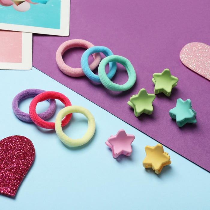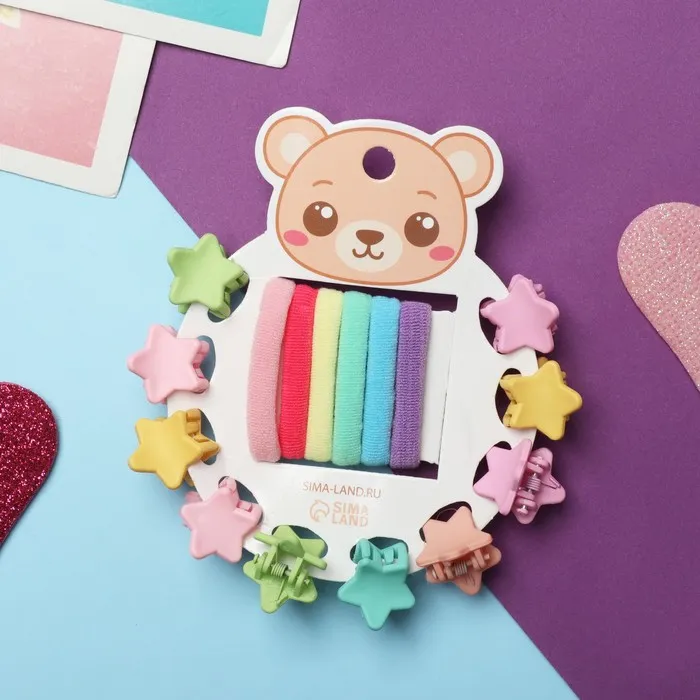Комплект включает 6 резинок и 10 мини-крабиков в виде звёздочек. Все аксессуары выполнены из безопасных для детей материалов, что делает их идеальными для ежедневного использования.
