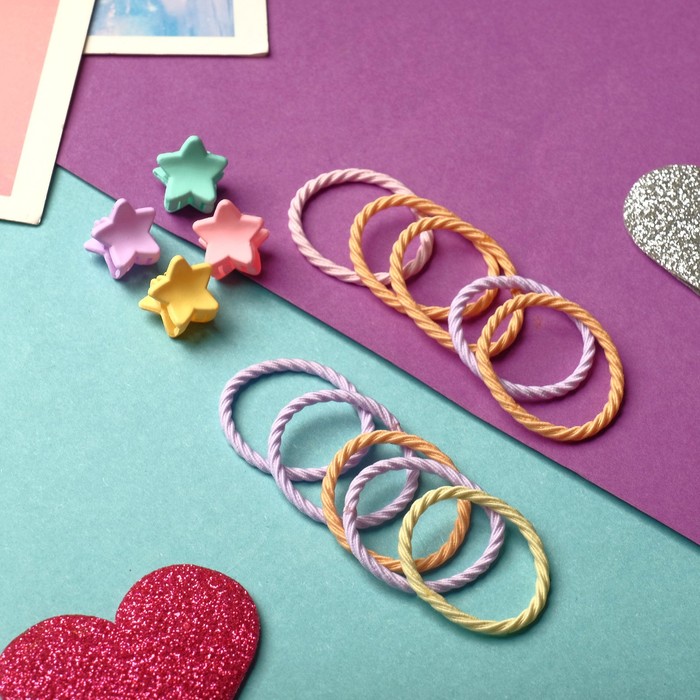 - Яркий дизайн и звёздочка: Заколка-звезда станет изюминкой прически, а нежные пастельные и сочные оттенки резинок подойдут под любое настроение и гардероб.