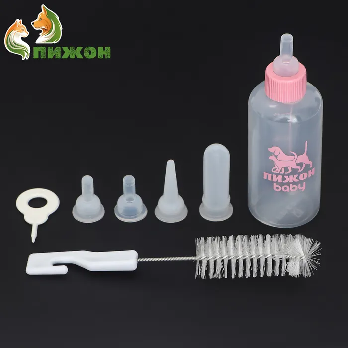 Набор для вскармливания щенков, котят и грызунов ПИЖОН. В комплекте содержится: 1 бутылочка объемом 60 мл, 4 соски, 2 короткие длиной 2 см, 1 длиная с тонким носиком 3 см, 1 длиная с толстым носиком 4 см, 1 ершик-щётка для мытья бутылочки.Показания к применению: для искусственного вскармливания новорожденных и подрастающих щенков, котят и других животных, а также для кормления больных и выздоравливающих животных. Способ применения: кончик резиновой соски проткните иглой или отрежьте верхушку ножницами. Будьте осторожны, потому что из-за слишком большого отверстия в соске животное может подавиться. После каждого использования, тщательно помойте бутылочку и соску.