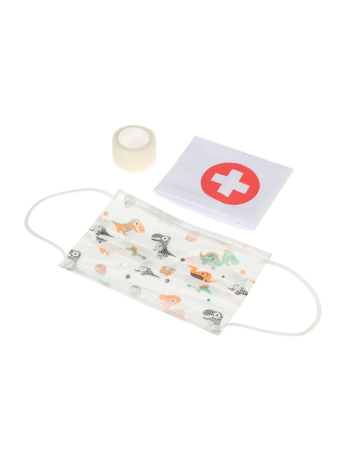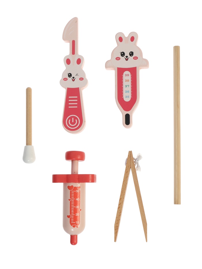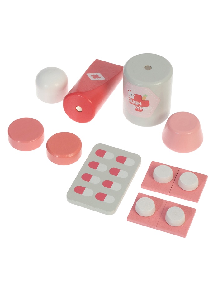 - В наборе — стетоскоп, шприц без иглы, тонометр, термометр, бутылочка с «лекарством», пластыри и другие атрибуты терапевта.