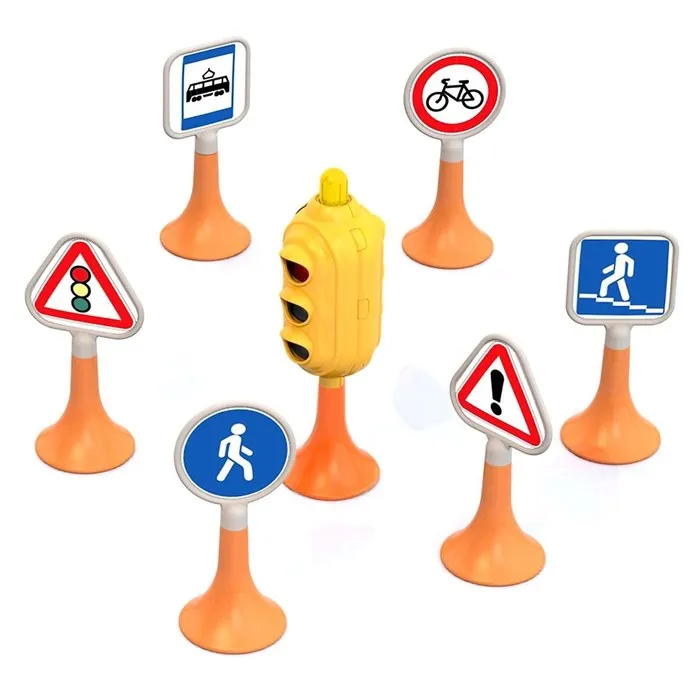 Игровой набор ТМ «Нордпласт» идеально подойдёт для юного водителя. Благодаря дорожным знакам ребёнок сделает реалистичным движение машинок по автотреку, полу или песочнице. А с помощью поворотного барабана на светофоре даже получится менять зелёный, жёлтый и красный цвета сигналов.