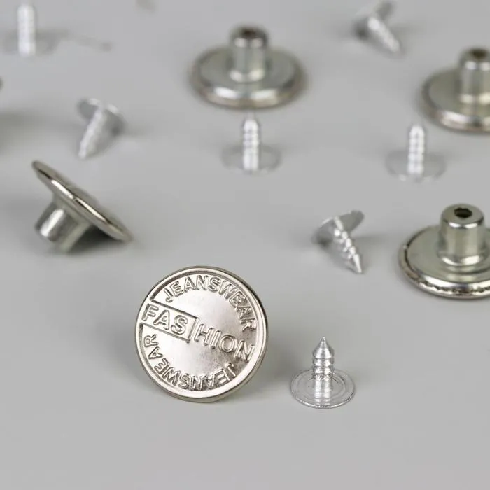 Джинсовые пуговицы состоят из двух частей. Верхняя часть - это шляпка, которая может быть гладкая, с рисунками, стразами, покрыта эмалью и иметь различные цвета под металл: никель, латунь, чёрный никель, серебро, старое серебро и т.д. Установка застёжки джинсовой пуговицы на одежду производится с помощью пресса и специальных насадок.