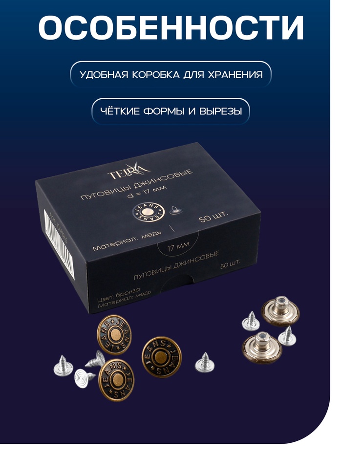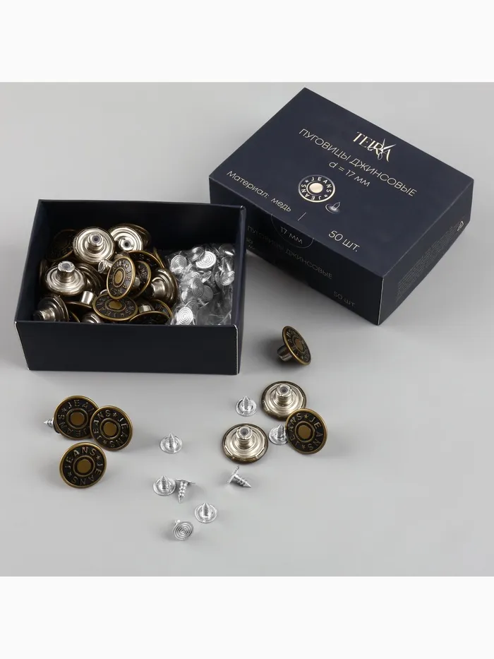 Зачем нужны такие пуговицы: они обеспечивают не только функциональность, но и фирменный стиль джинсовых вещей. Это базовая фурнитура для тех, кто шьёт одежду своими руками, ремонтирует любимые джинсы или создаёт аксессуары. Набор удобен для постоянного хранения в мастерской — всегда будет запас на случай срочного ремонта или нового дизайнерского решения.
