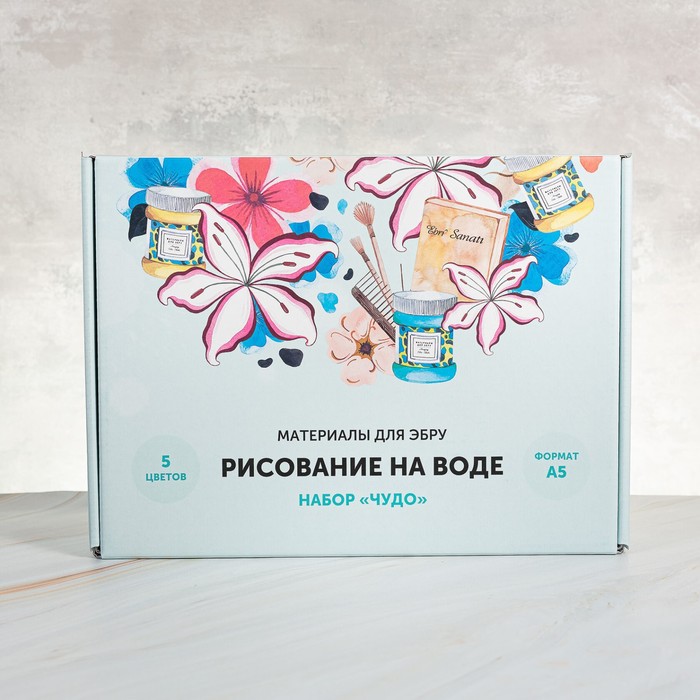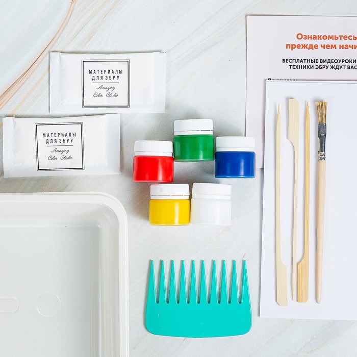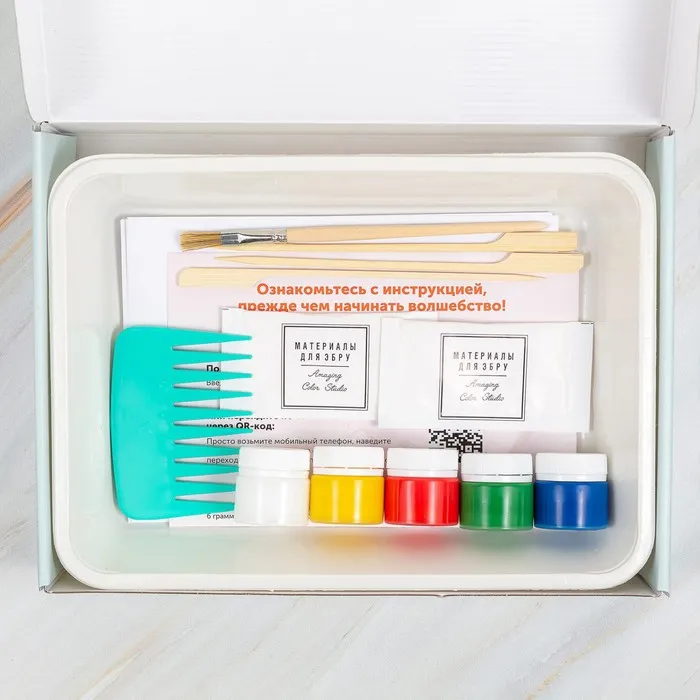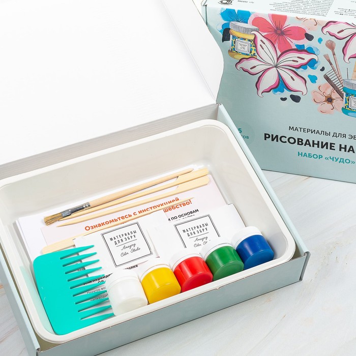 Набор «Эбру-чудо» имеет полноценный состав и его хватит для того, чтобы увидеть свое маленькое чудо в технике рисования на воде и научиться простым основам эбру. Формат ванночки — А5.