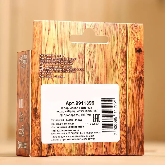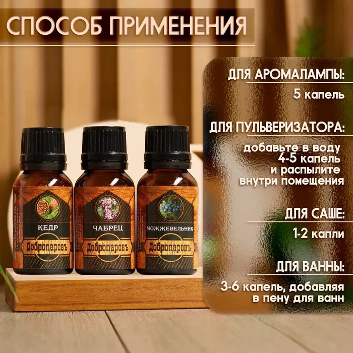 Продукт «Трио эфирных масел» станет идеальным спутником для тех, кто ценит природные ароматы и ищет естественное решение для домашнего аромакология. Этот набор включает композиции кедра, тимьяна и можжевельника, объёмом 17 мл каждый, создавая гармонию в вашем доме и заряжая бодростью каждый день.