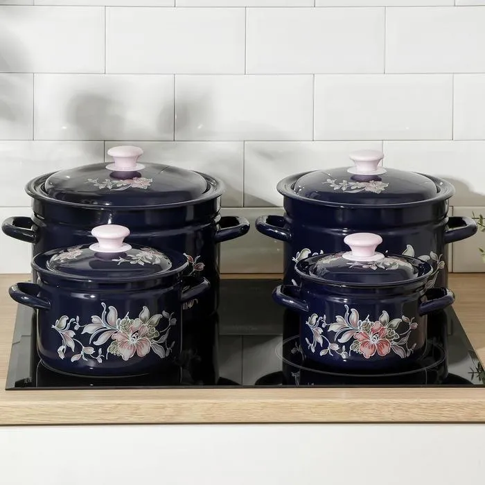 Все кастрюли выполнены из высококачественной стали и покрыты прочной эмалью, которая защищает посуду от коррозии и обеспечивает её долговечность. Эмалевое покрытие легко моется и не впитывает запахи, что делает набор идеальным выбором для приготовления различных блюд.