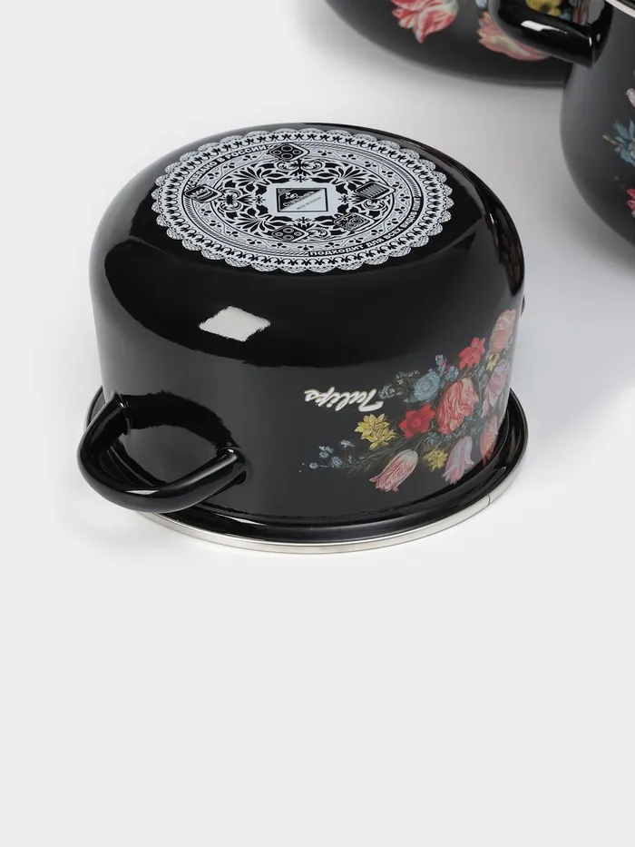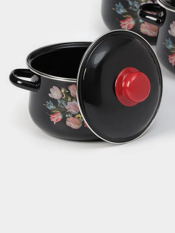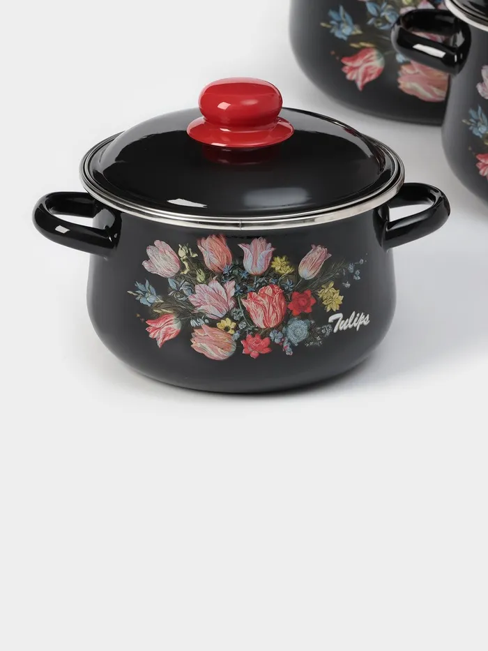 Набор эмалированных кастрюль «Букет тюльпанов», 3 предмета: 2 л, 4 л, 5,5 л, индукция, цвет чёрный — Характеристики