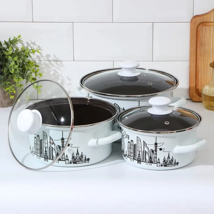 Все кастрюли выполнены из высококачественной стали и покрыты прочной эмалью, которая защищает посуду от коррозии и обеспечивает её долговечность. Эмалевое покрытие легко моется и не впитывает запахи, что делает набор идеальным выбором для приготовления различных блюд.