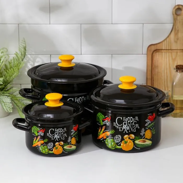 Все кастрюли выполнены из высококачественной стали и покрыты прочной эмалью, которая защищает посуду от коррозии и обеспечивает её долговечность. Эмалевое покрытие легко моется и не впитывает запахи, что делает набор идеальным выбором для приготовления различных блюд.