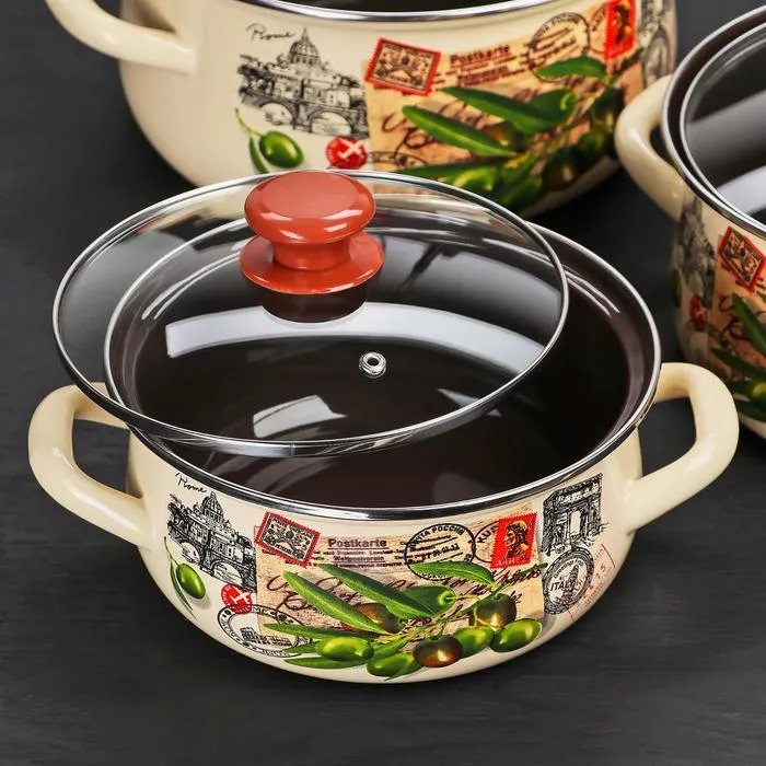 Все кастрюли выполнены из высококачественной стали и покрыты прочной эмалью, которая защищает посуду от коррозии и обеспечивает её долговечность. Эмалевое покрытие легко моется и не впитывает запахи, что делает набор идеальным выбором для приготовления различных блюд.
