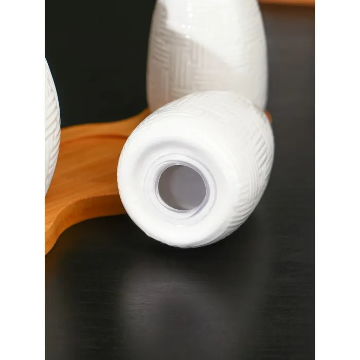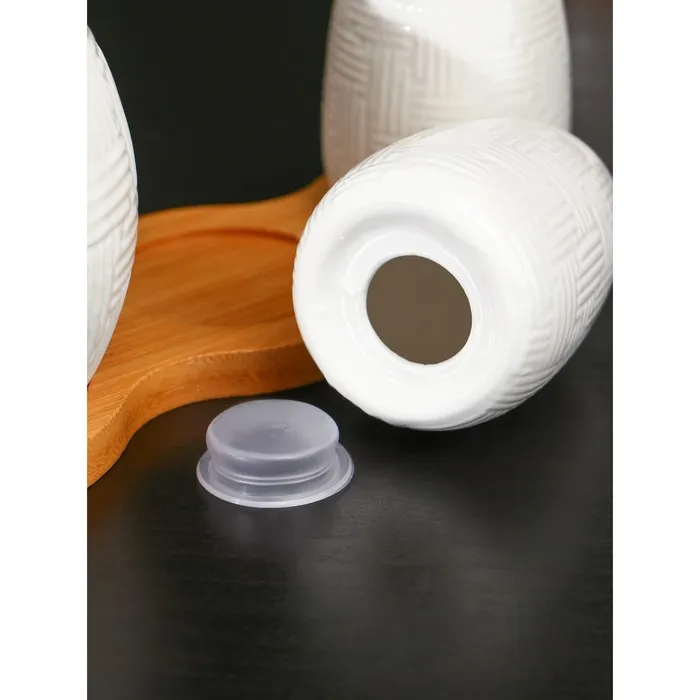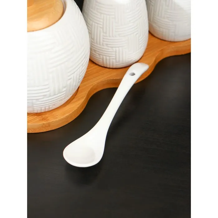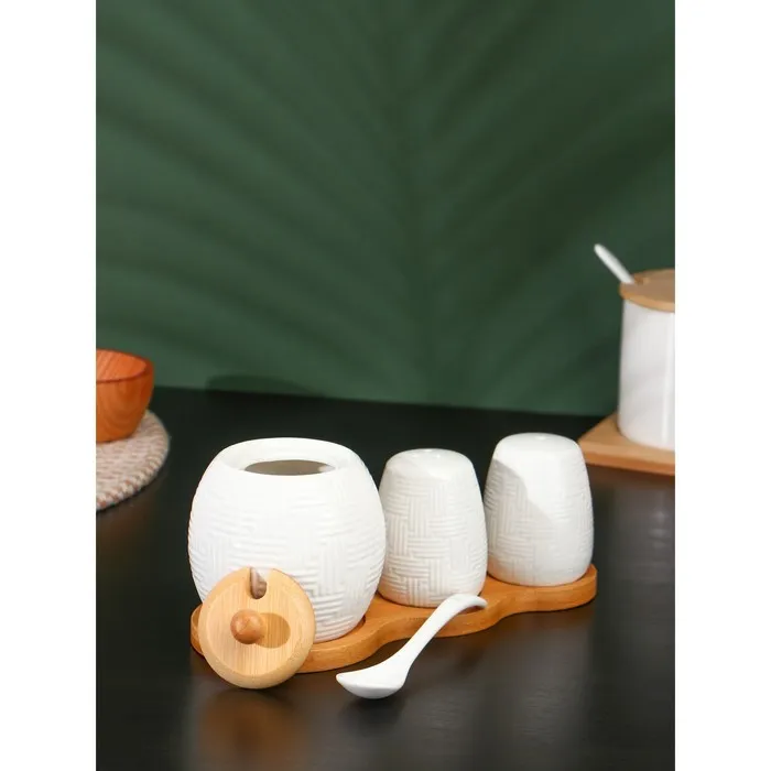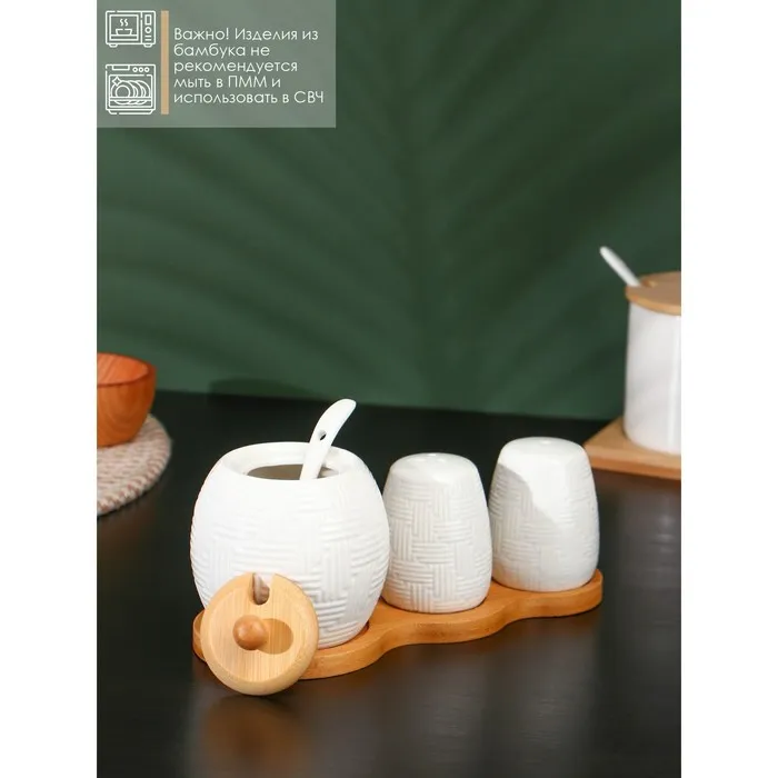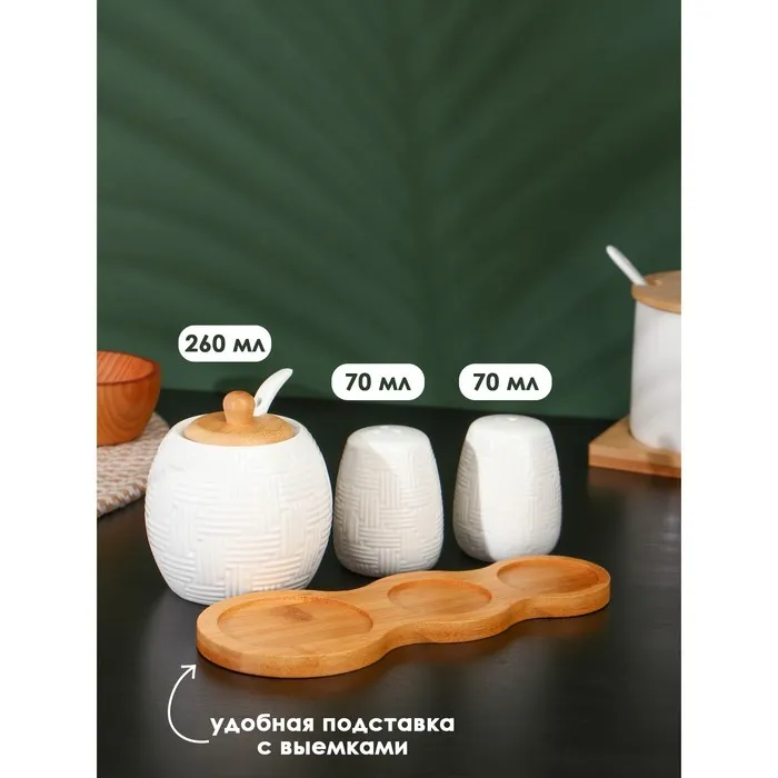 Набор фарфоровый для специй на бамбуковой подставке BellaTenero, 3 предмета: солонка 70 мл, перечница 70 мл, сахарница с ложкой 260 мл, белый — Характеристики