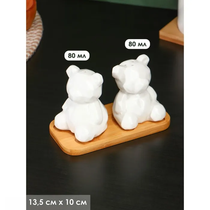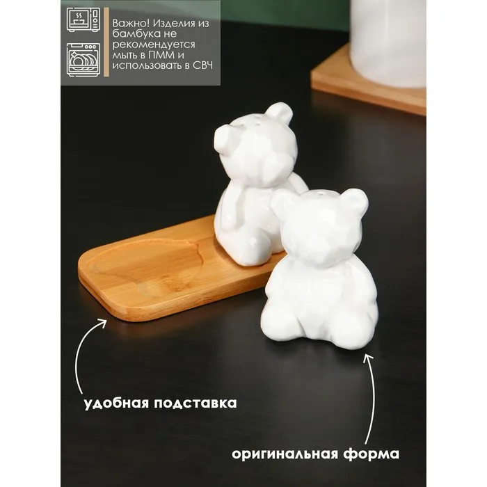 Набор фарфоровый для специй на бамбуковой подставке BellaTenero «Медведи», 2 предмета: солонка 80 мл, перечница 80 мл, белый — Характеристики