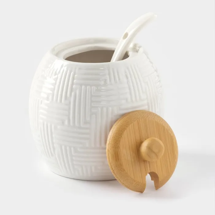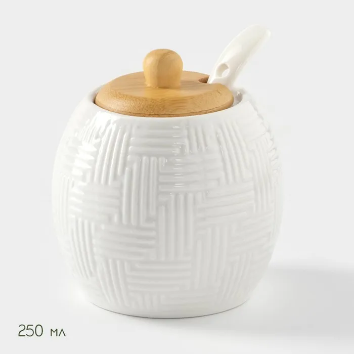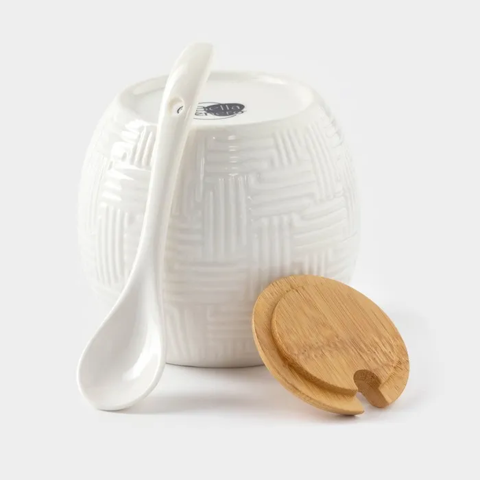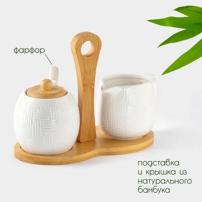 Набор фарфоровый сервировочный BellaTenero, 4 предмета: молочник 250 мл, сахарница с крышкой 250 мл, ложка, бамбуковая подставка, белая — Характеристики