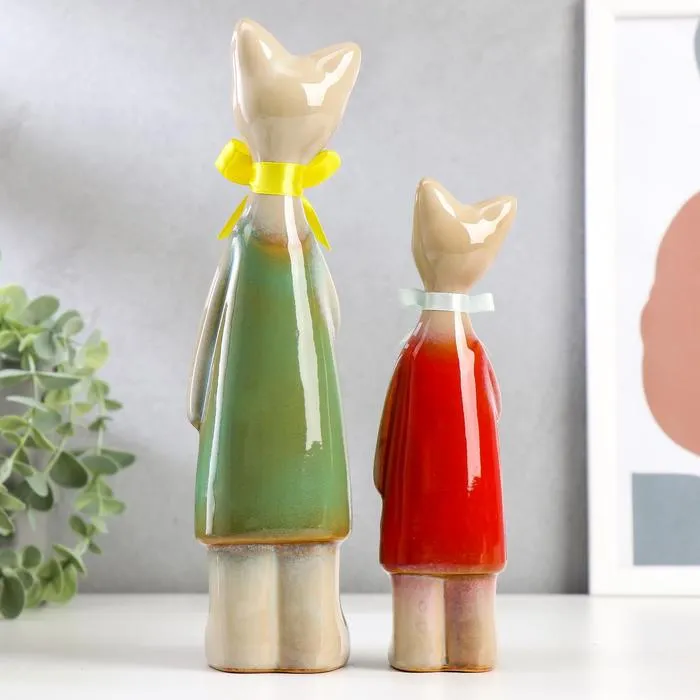 Представляем очаровательный набор из двух керамических фигурок, которые станут настоящим украшением вашего дома и подарят тепло уютных моментов. Эти две кошечки, играющие с рыбкой, словно оживают благодаря яркой глазурованной отделке и детализированной проработке. Высота фигурок — 19 см и 24,5 см — делает их заметными, но при этом компактными элементами декора. Каждая из них отличается своим неповторимым характером, выраженным в позах и цветовых решениях.