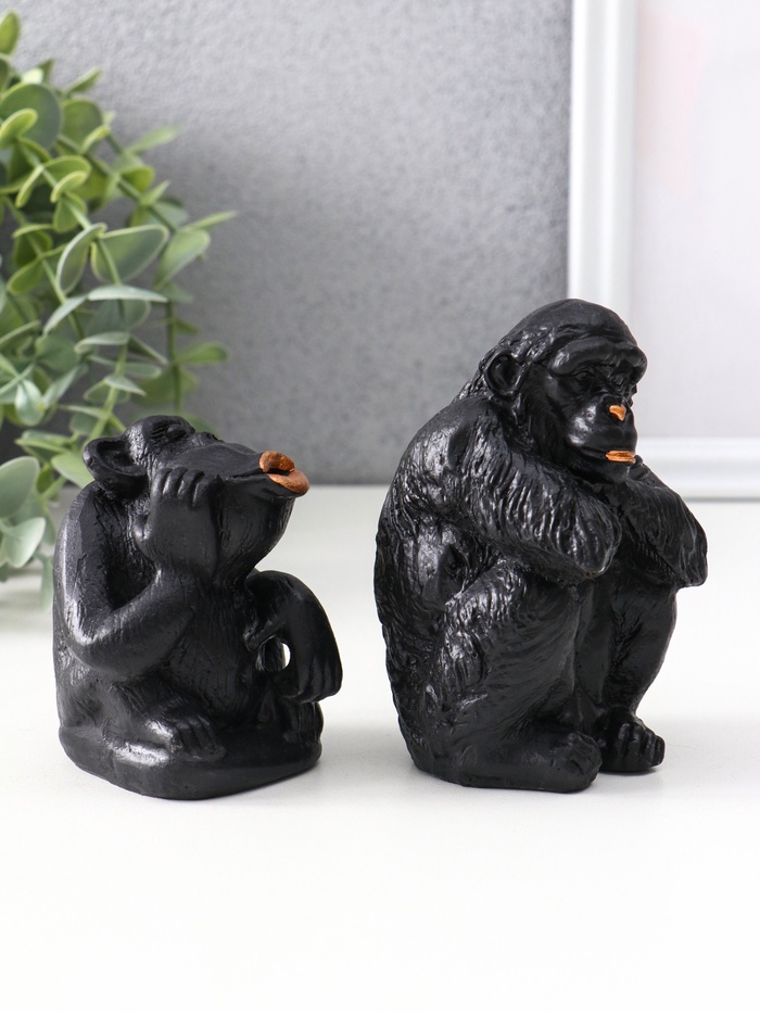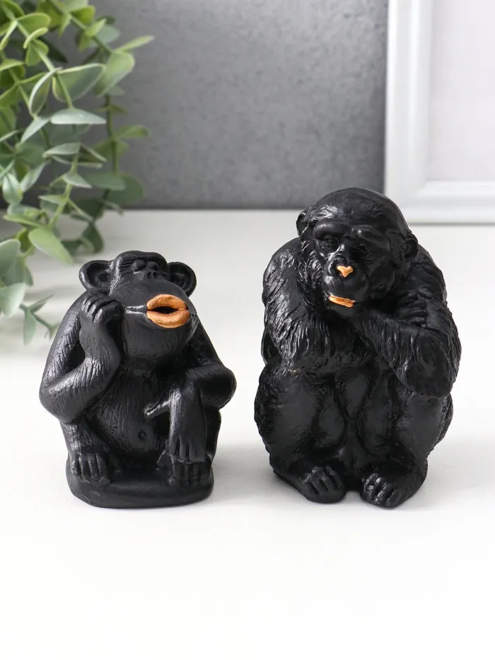 Элегантный набор из двух фигурок обезьян в чёрном цвете — это сочетание лаконичности и выразительности, которое привнесёт в интерьер нотки загадочности и стиля. Изготовленные из гипса, эти статуэтки отличаются прочностью и приятной матовой текстурой, подчёркивающей утончённость форм и деталей.