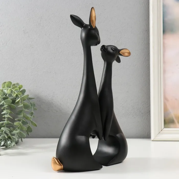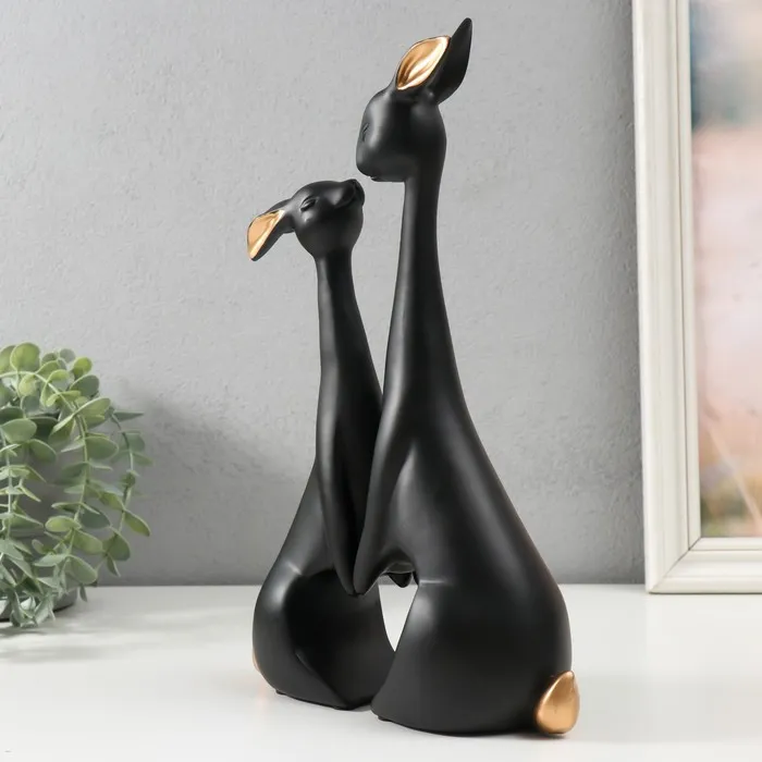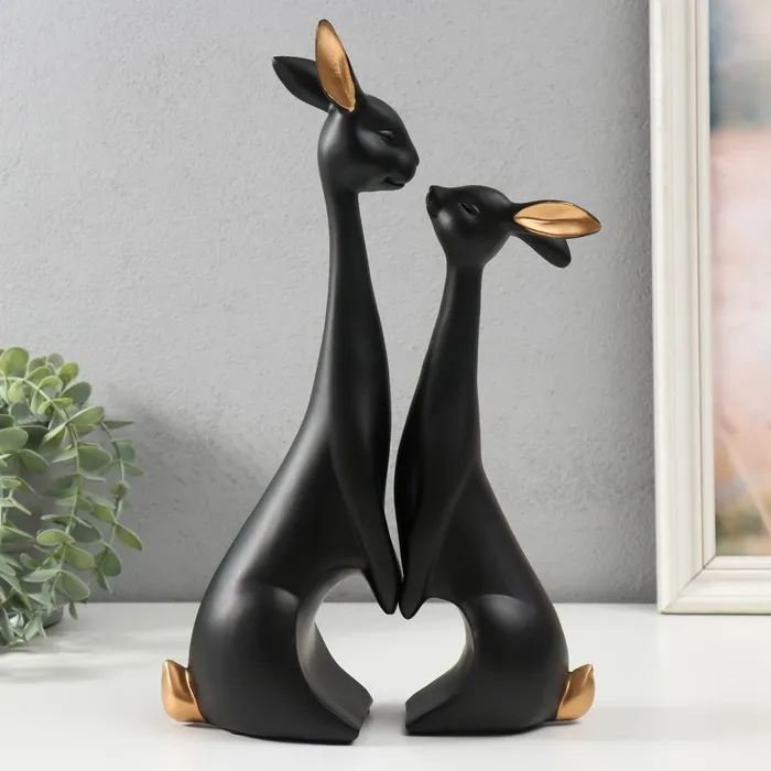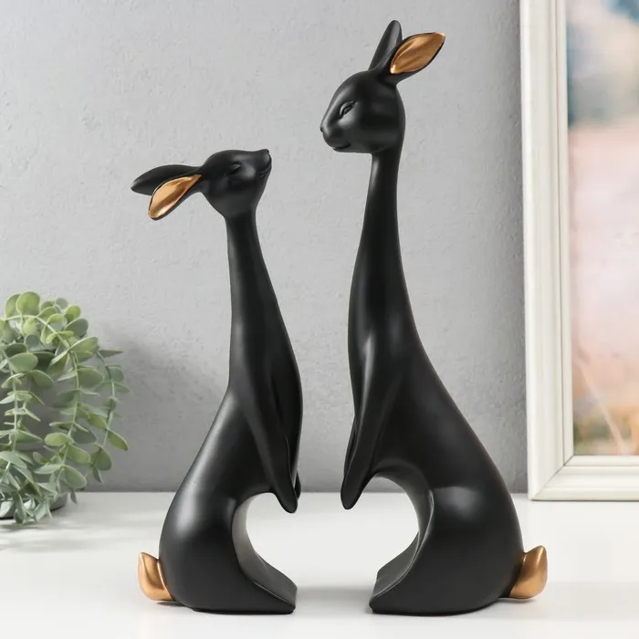 Этот стильный набор из двух зайцев в элегантной чёрно-золотой гамме привнесёт ноту современного шика в любой интерьер. Фигурки разного размера (24,5 см и 32 см) создают интересную динамику, а золотые акценты на хвостиках добавляют благородный блеск.