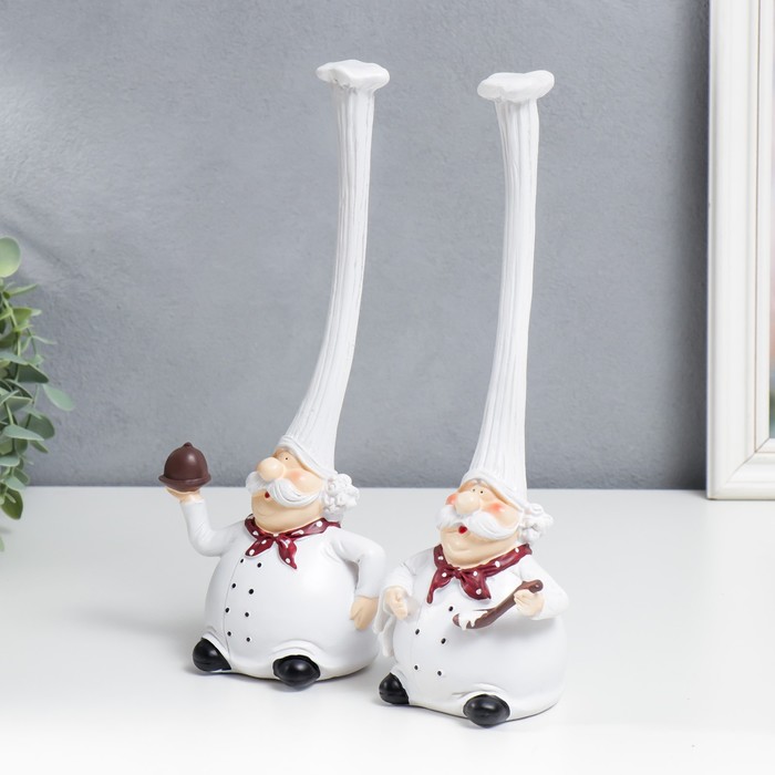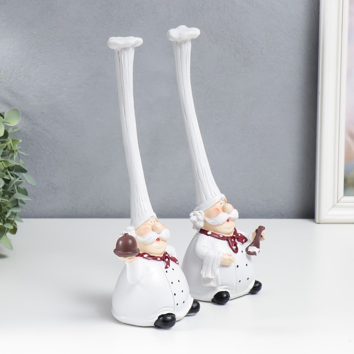 Эти фигурки шеф-поваров станут ярким акцентом на кухне или тёплым напоминанием о важности кулинарного мастерства. Два усатых мастера в классических высоких колпаках передают дух профессиональной кухни, где ценится каждая деталь. Их сдержанная элегантность и выразительные черты лица добавляют интерьеру характера и уюта.