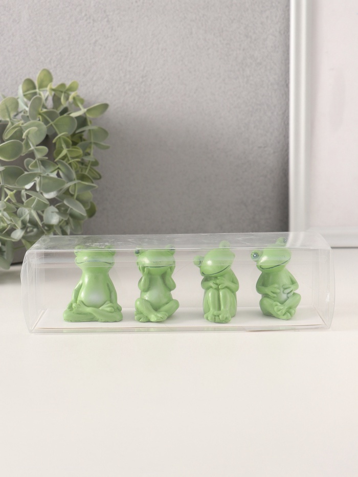 Набор состоит из четырёх фигурок лягушек, каждая из которых имеет уникальную позу и выражение лица. Высота фигурок составляет 4.8 см, а размеры варьируются от 3 см до 3.6 см в зависимости от позы. Зеленый цвет и красочное покрытие делают фигурки яркими и привлекательными.