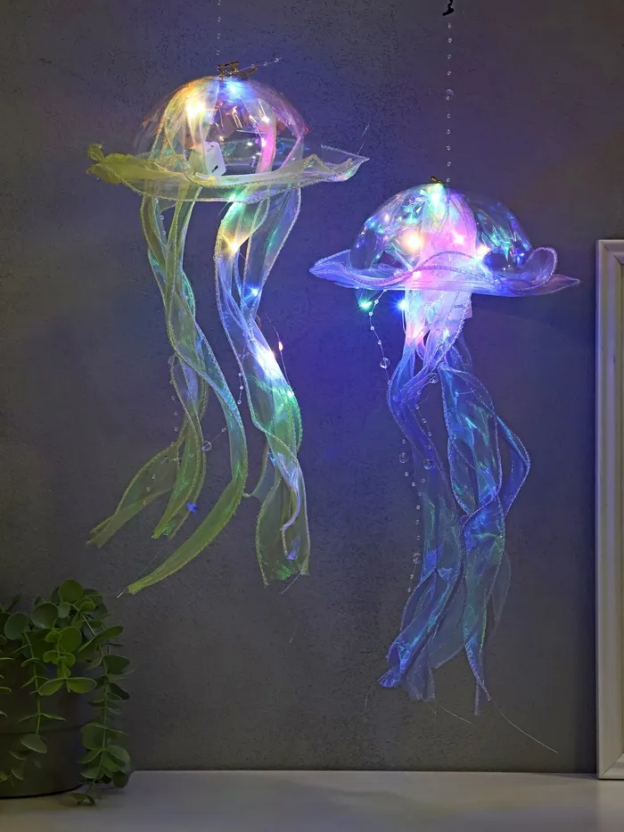 Каждая медуза словно парит в воздухе, оживляя комнату своим присутствием. Благодаря автономному питанию от трех батареек типа AG13, эти светящиеся фигуры можно разместить где угодно: в спальне, гостиной или даже на вечеринке под открытым небом. Их универсальная тематика делает их подходящими для любого случая — будь то романтический вечер или детский праздник. Компактный размер (20×20×50 см) позволяет легко интегрировать их в любое пространство, не нарушая гармонии интерьера.