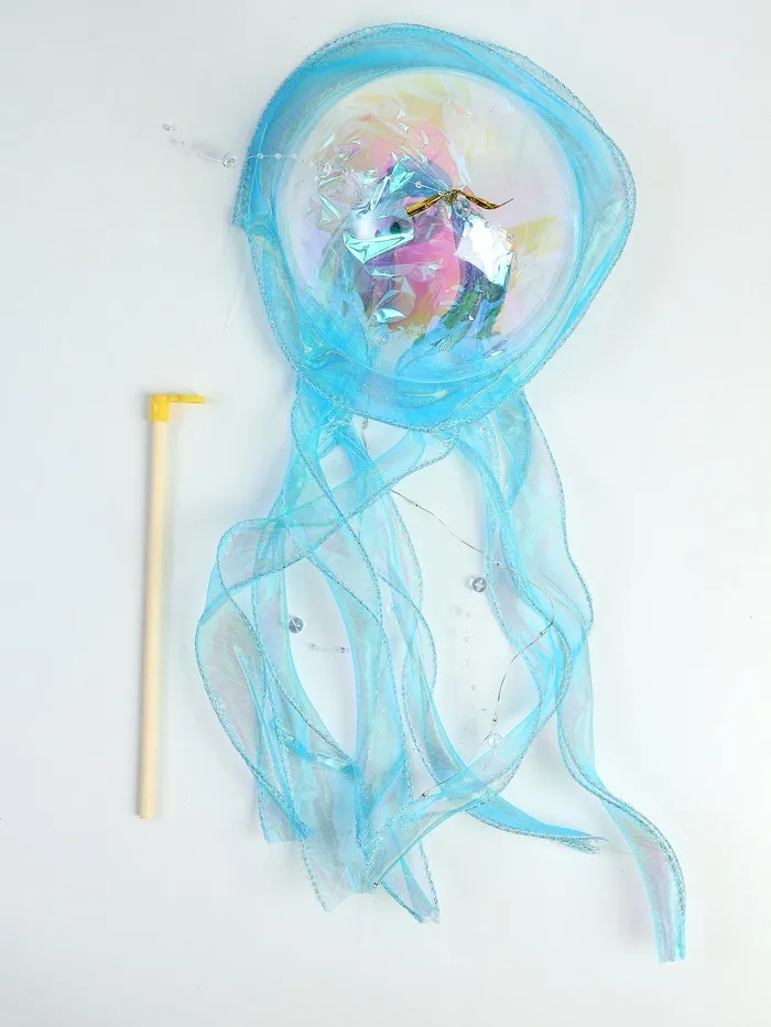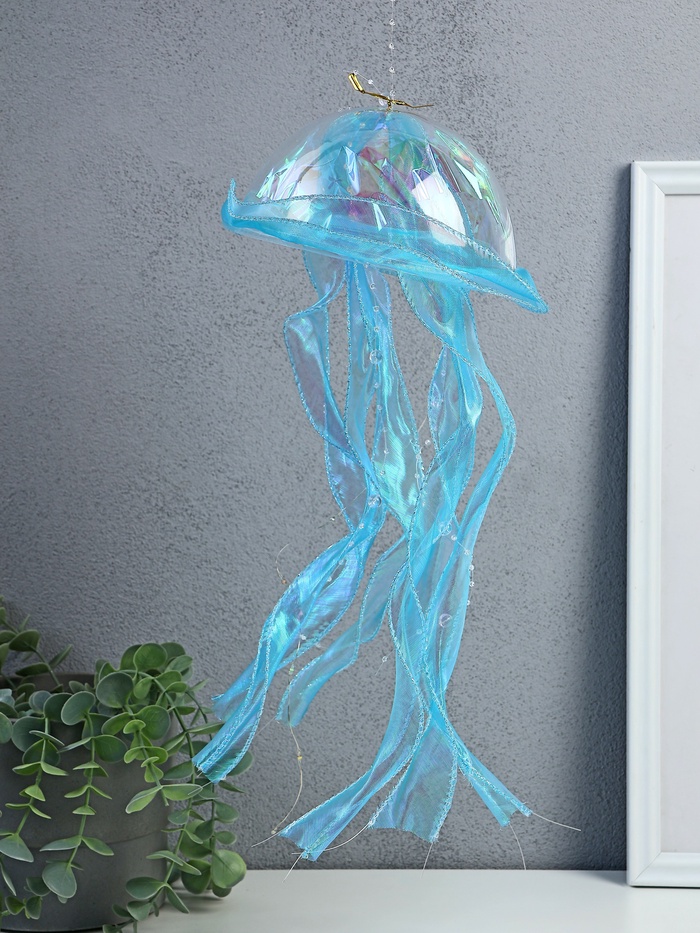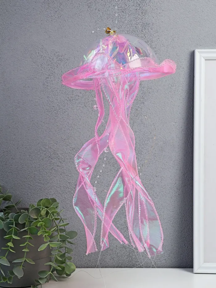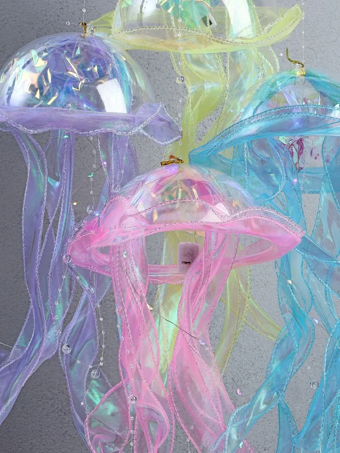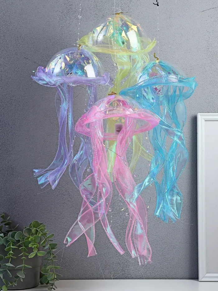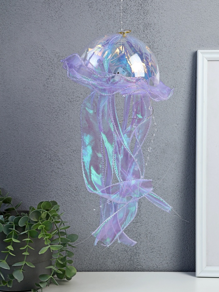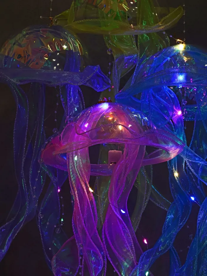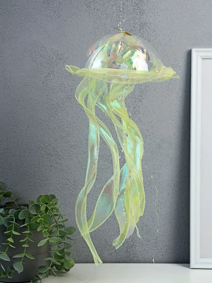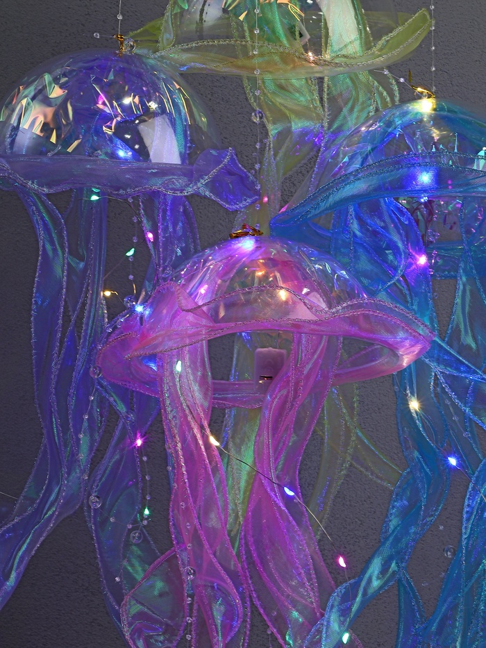 Набор из четырёх подвесных светящихся фигурок в форме медуз привнесёт в любой интерьер мягкое и завораживающее освещение. Высота каждой фигуры — 50 см, что делает их заметным декоративным элементом, способным создать атмосферу уюта и сказочности в комнате. Благодаря одноцветной подсветке и разнообразию оттенков — сиреневого, жёлтого, розового и голубого — эти светильники гармонично впишутся в любой стиль и праздничное оформление.