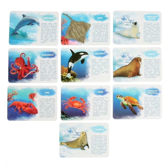 Набор фигурок животных для детей с обучающими карточками «Подводный мир», карточки, по методике Монтессори — Характеристики