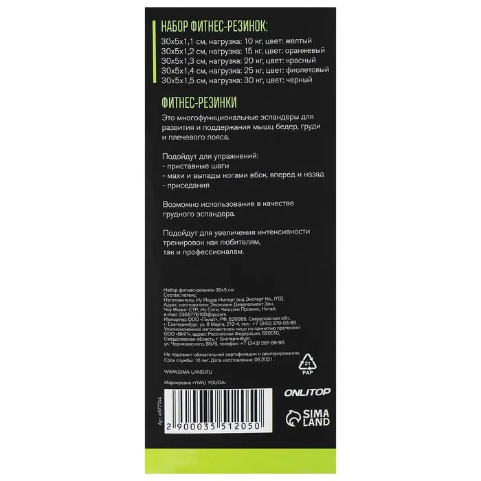 Набор фитнес-резинок ONLYTOP: нагрузка 10, 15, 20, 25, 30 кг, 5 шт., 30х5 см — Характеристики