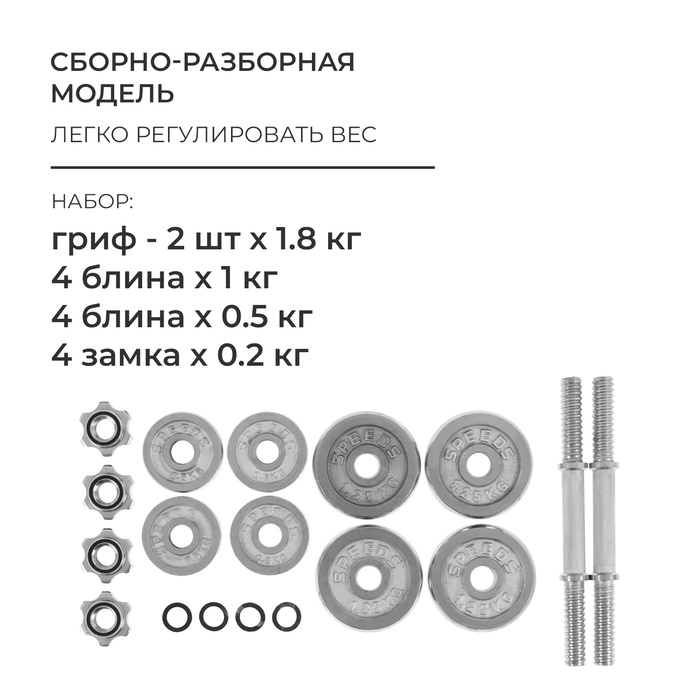 Набор гантелей подойдёт для новичков и опытных спортсменов. Замки на гантели для закрепления блинов выполнены из стали. В наборе 2 грифа по 1,8 кг, 4 блина по 1 кг, 4 блина по 0,5 кг и 4 замка по 0,2 кг.
