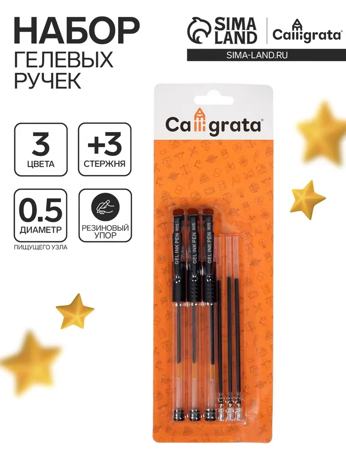 Набор гелевых ручек, 0.5 мм, 3 штуки + 3 чёрных стержня — Характеристики