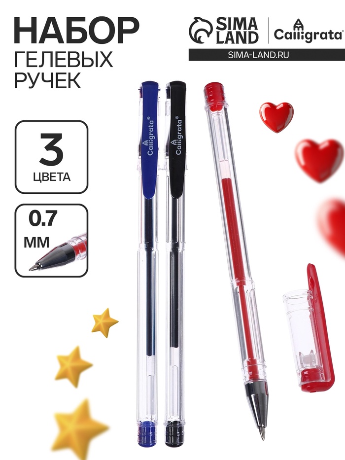 Ручка имеет прозрачный корпус. Сменный стержень длиной 128 мм со стандартным наконечником позволит использовать ручку максимально долго. Диаметр пишущего узла, равный 0,5 мм, создает линию письма, равную 0,35 мм. Набор включает гелевые ручки из 3 различных цветов чернил: синий, черный, красный. Набор гелевых ручек CALLIGRATA идеально подходит для работы с документами и выделения чего-то важного!