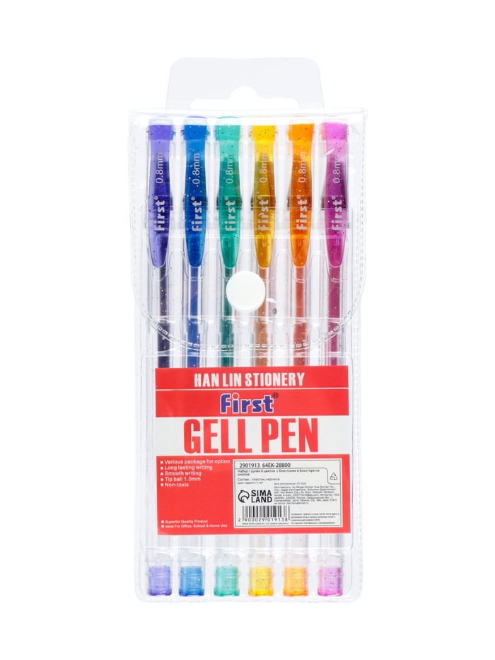 - Шесть неавтоматических гелевых ручек с защитным колпачком и резиновым грипом.