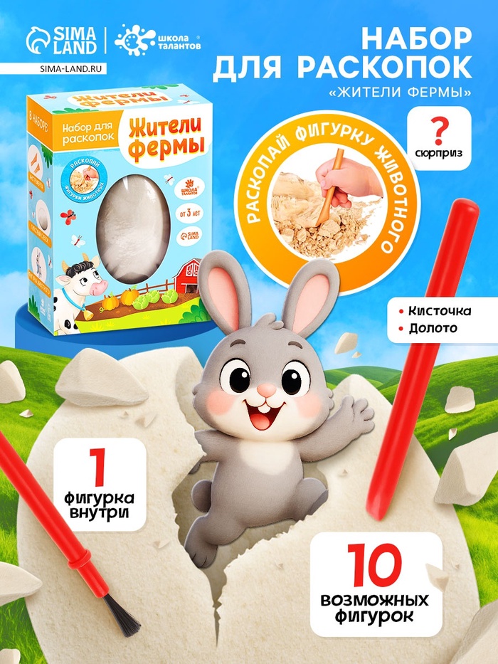 В наборе: долото, кисточка, лупа, гипсовый объект с кладом внутри.
