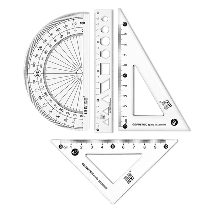 В комплекте: линейка 20 см, 2 угольника, транспортир в пенале.