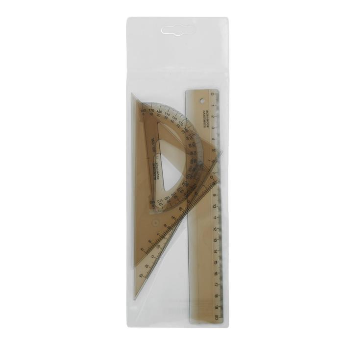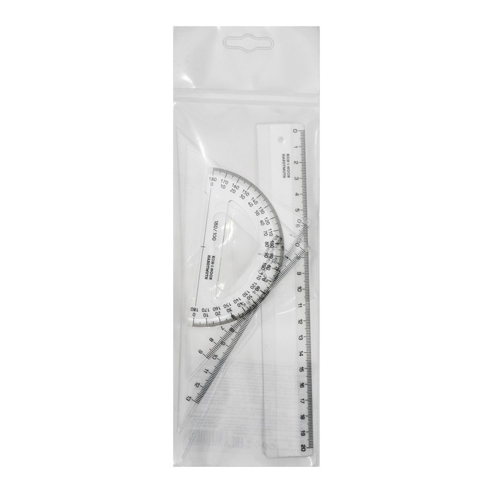 Геометрический набор среднего размера состоит из следующих продуктов: набор квадратов с вертикалью, набор квадратов, линейка 30 см и транспортир. Все изделия изготовлены из прозрачного полистирола. Для печати разметки используется технология горячего тиснения или точная трафаретная печать. Набор подходит для технического рисования, черчения и измерения прямых линий, сечений, параллельных линий, вертикалей, углов и многого другого в школе или офисе.