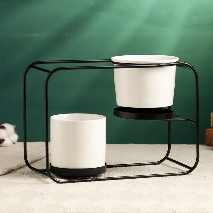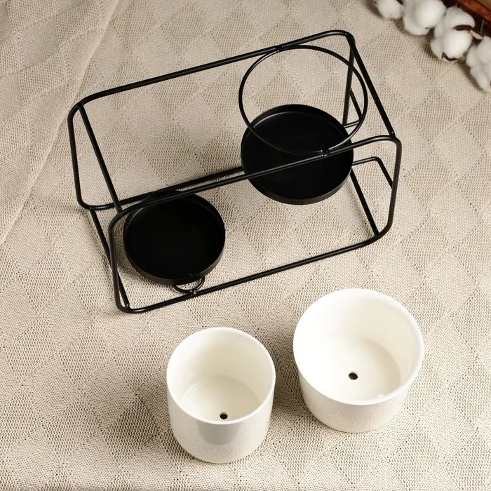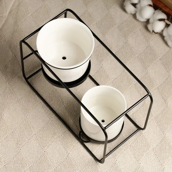 Набор горшков для цветов, 2 шт., 420 / 500 мл, 27×12×19 см, керамика, белые, на чёрной металлической подставке — Характеристики