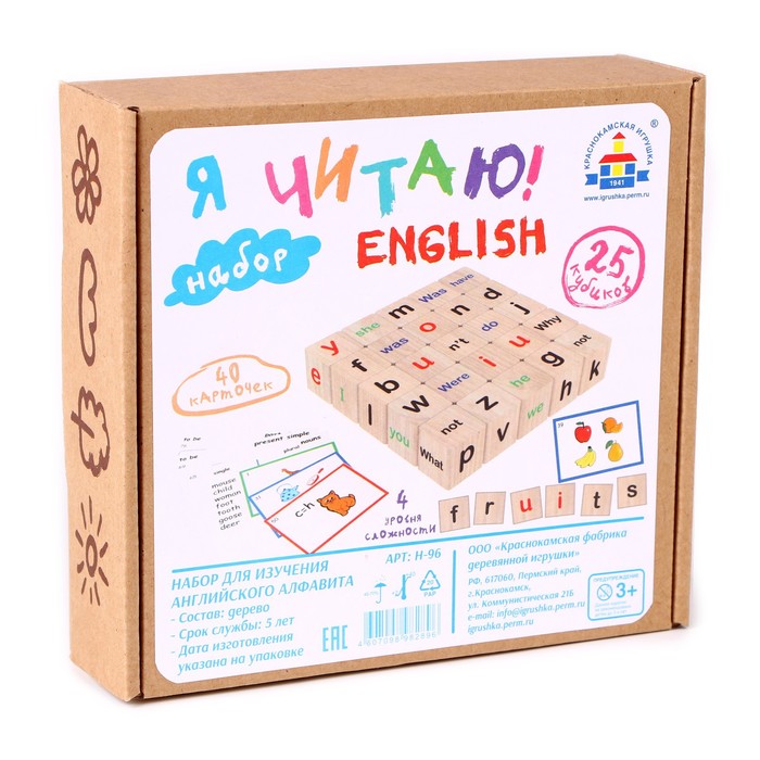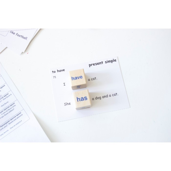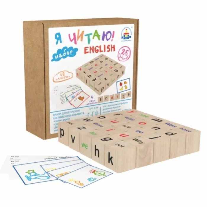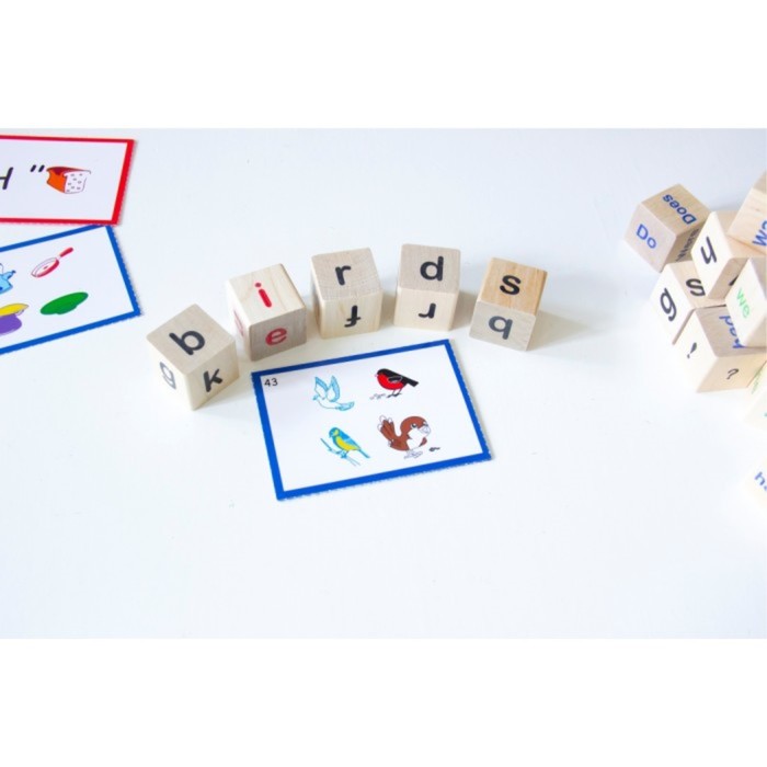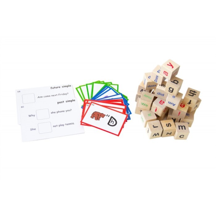 - Кубики с буквами английского алфавита, сочетаниями букв, местоимениями, глаголами, отрицательными частицами, знаками препинания, вопросительными словами — 25 шт.