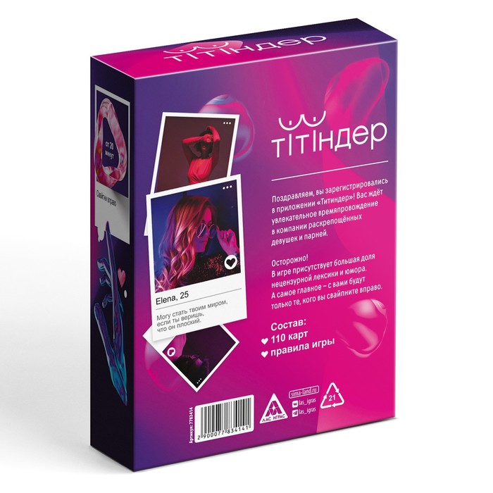 - Настольная игра «Титиндер» - вам предстоит выкладывать карты с анкетами и угадывать выбор ведущего, если угадали, получаете очки и выигрываете.