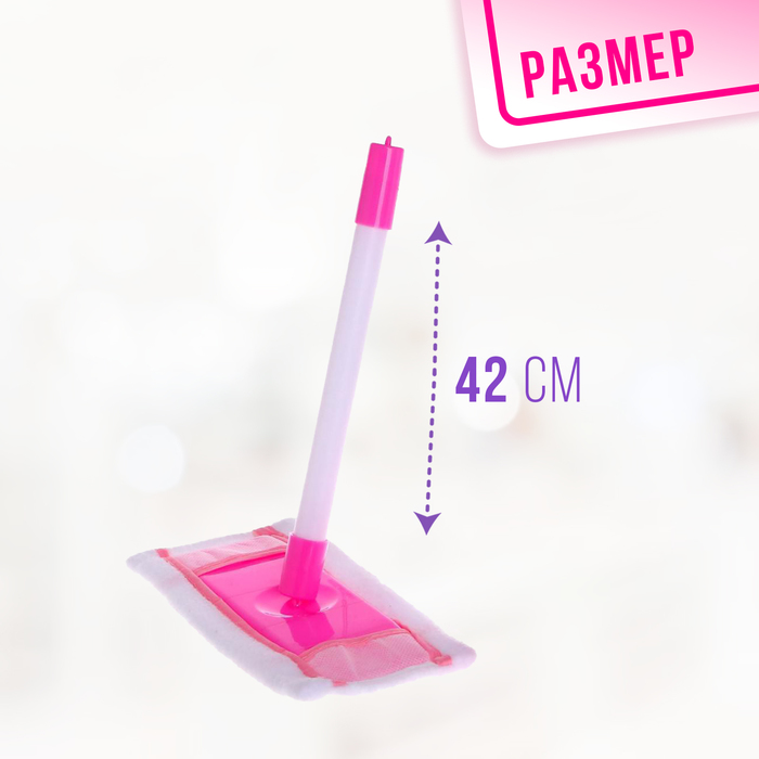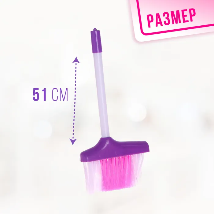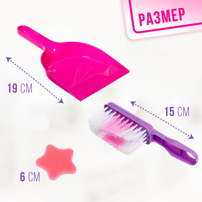 - Полный комплект для уборки: швабра, метла, совок, щётка и губка. Все предметы подобраны с учётом детского роста и удобны для маленьких рук.