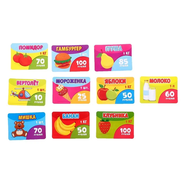 - В набор входят продукты, банковская карта, монеты и ценники. Сканер «считывает» штрихкоды — как в настоящем супермаркете. Малыш научится складывать суммы, принимать оплату картой или наличными.